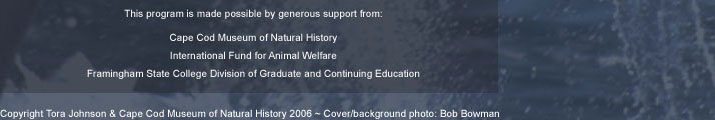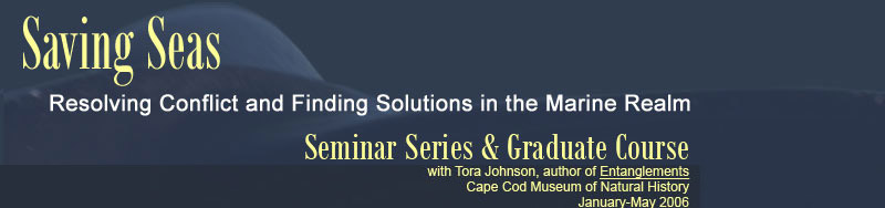 The Saving Seas seminars concluded on May 23, 2006, with a compelling panel on whaling comprised of internationally reknowned experts. Read topic pages with links to more information and notes on each session. Check out DVDs of Saving Seas sessions from the library at the Cape Cod Museum of Natural History Comment on the Saving Seas session topics on the bulletin board. This landmark seminar series/ graduate course at the Cape Cod Museum of Natural History in Brewster took place on alternate Tuesday evenings between January 17 and May 23, 2006, with an all-day Saturday workshop on April 8th. All sessions were open to the public. Through panel discussions by world-class experts on both sides of the issue, as well as lectures and workshops, we explored the sources of conflict and potential solutions for such controversial issues as Navy sonar and its effect on marine mammals, the fate of the right whale, competing claims to Georges Bank and Gulf of Maine groundfish stocks, herring and mackerel mid-water trawl fisheries and their impacts on marine food webs, and managing coastal resources for many interests. |